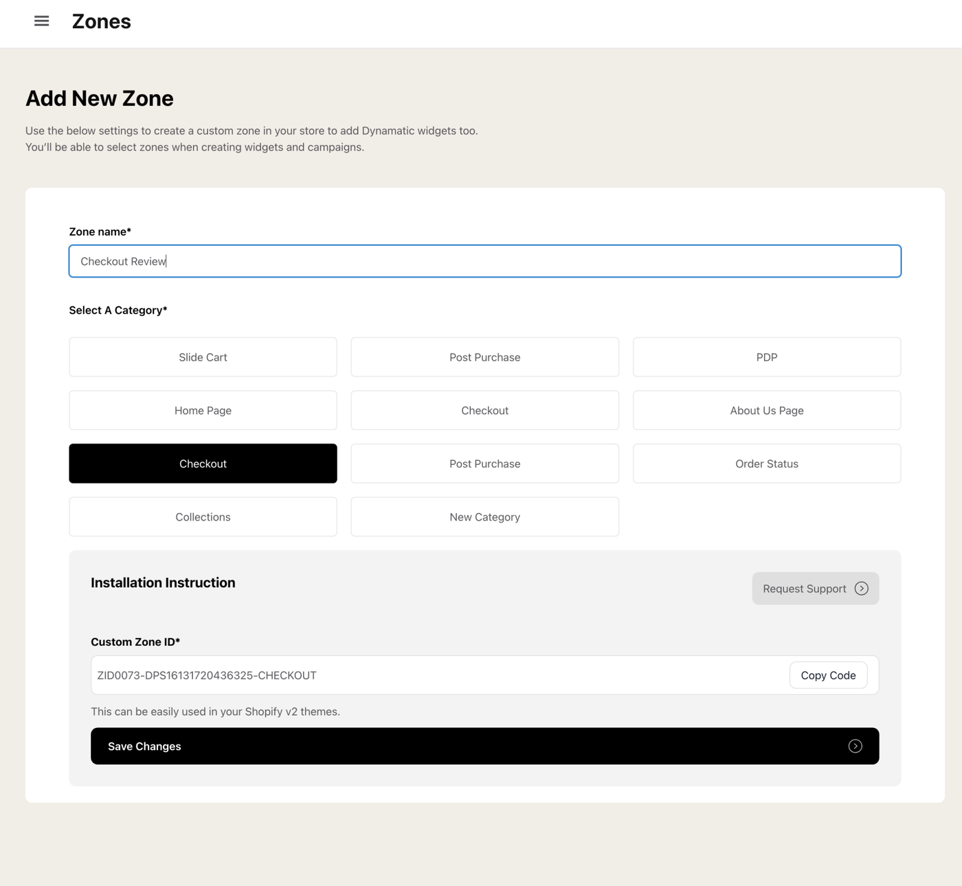As demonstrated below, you'll select the category, name the Zone, and click "Save Changes." The name of the zone is a friendly name to help you find the zone when creating a campaign/experience. We use the Zone names in a drop down, so naming the Zone something you'll remember is a best practice!
