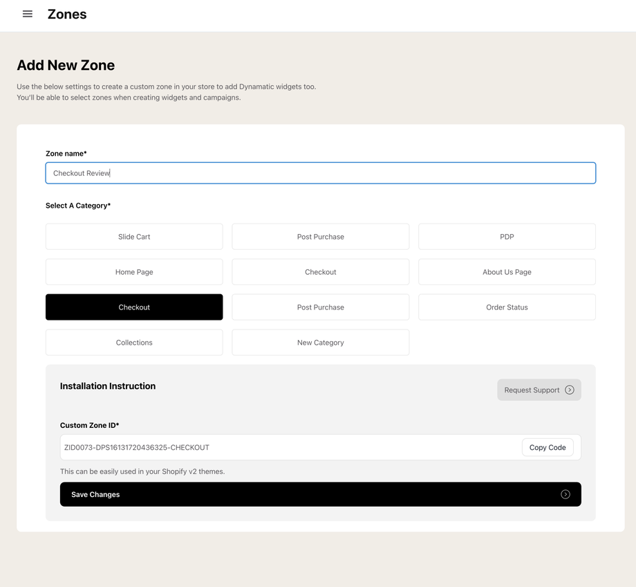 Head over to our app navigation and select > Placements > Create a Zone > and select the "Checkout Category." If you don't see a checkout category, you likely haven't created one yet, so simply create a new category called "Checkout."