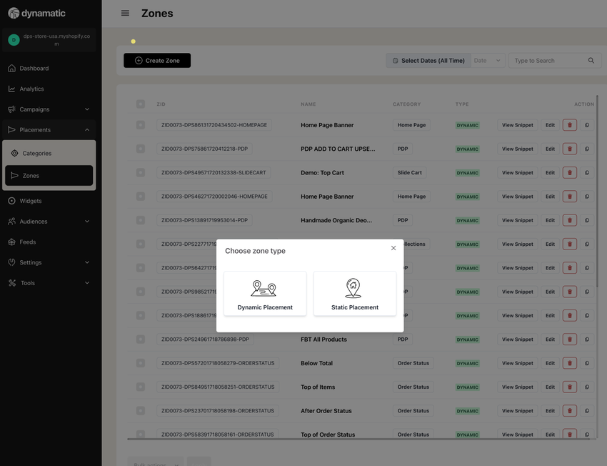 In the easiest terms, placements or zones are designated areas in your store that a Dynamatic widget can display. Imagine you owned a blog or News site, and your goal is to make money from display ads. You'd essentially work with a developer to create areas on different article formats, home page, etc where ads can be displayed. These would then be set up with an ad network and ad server so that you can easily display ads in those slots.