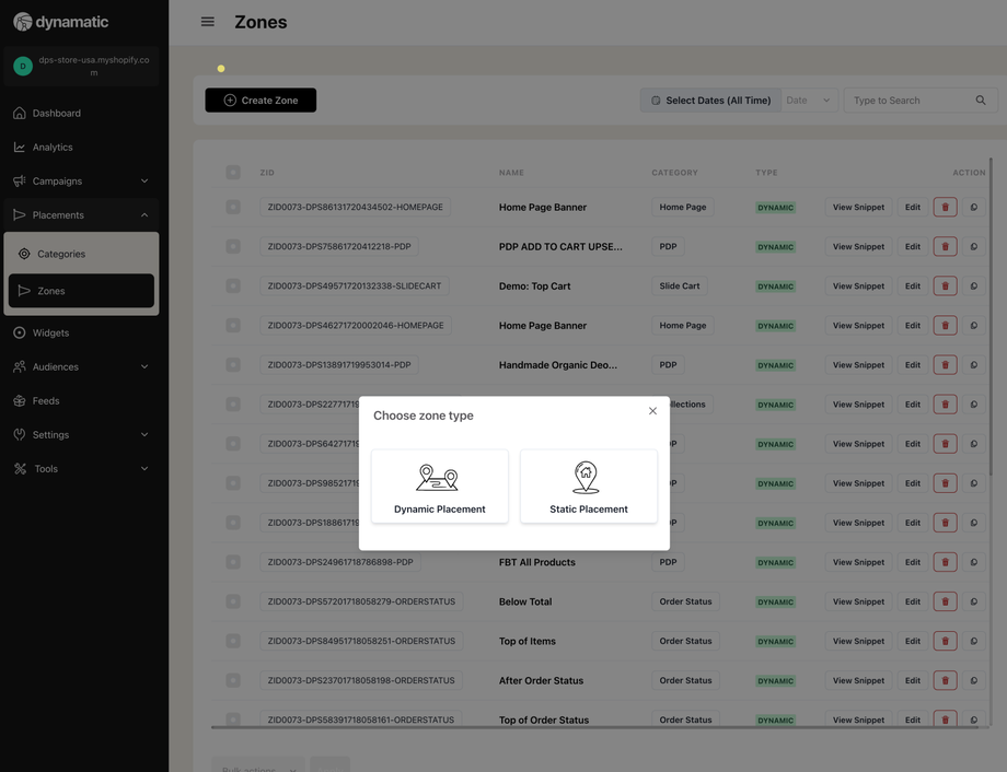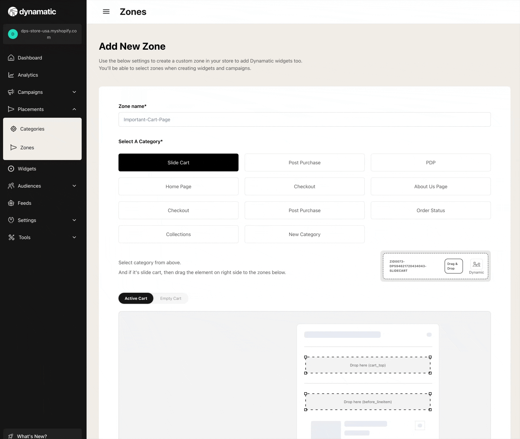 Another type of Placement is the Dynamatic Cart. Since Dynamatic's slide cart is wholly powered by us, adding placements to Dynamatic can not be done in the shopify theme editor. Instead, placements and zones are created inside our app backend.