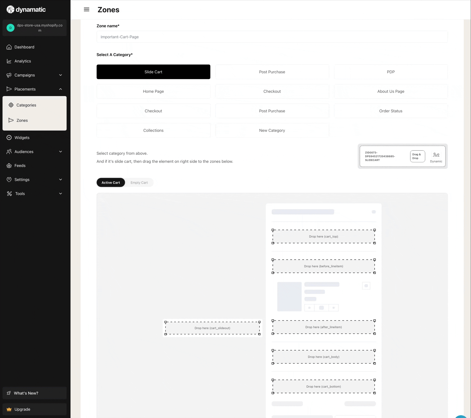 Slide cart zones are placements created inside the Dynamatic powered slide out cart draw. Since this cart is powered by Dynamatic, all the content of the cart is controlled from inside the Dynamatic App.