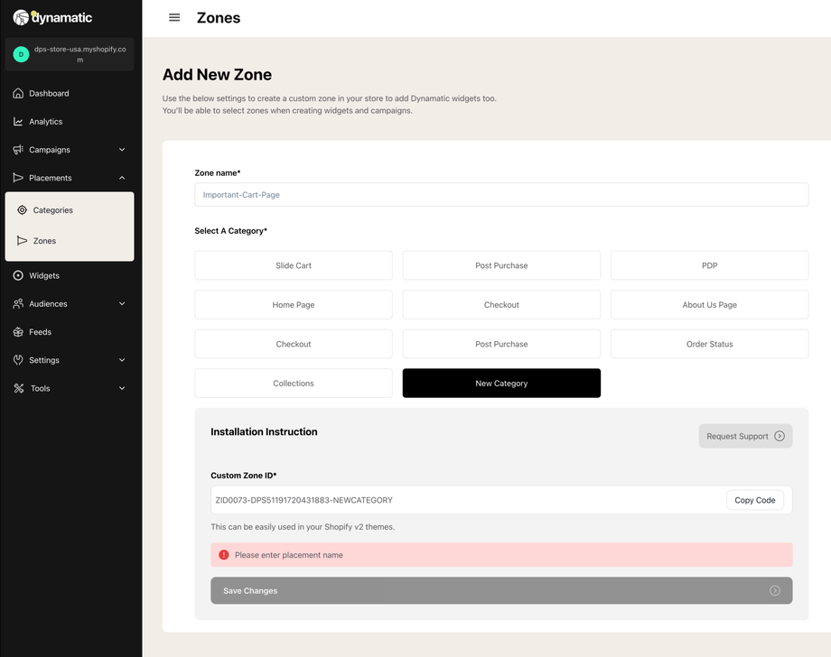 Creating a zone to be used for Dynamatic Widgets is a fairly simple process. Visit our app backend, and select the Placement tab from the navigation, and select "Zones."