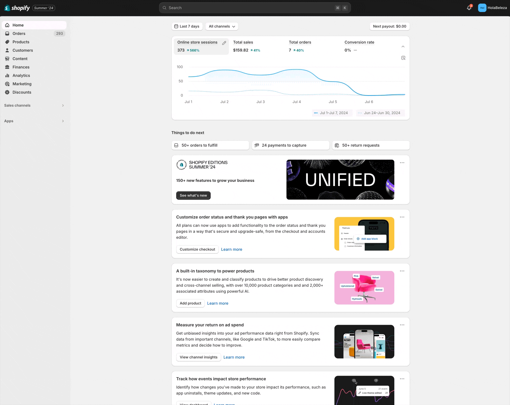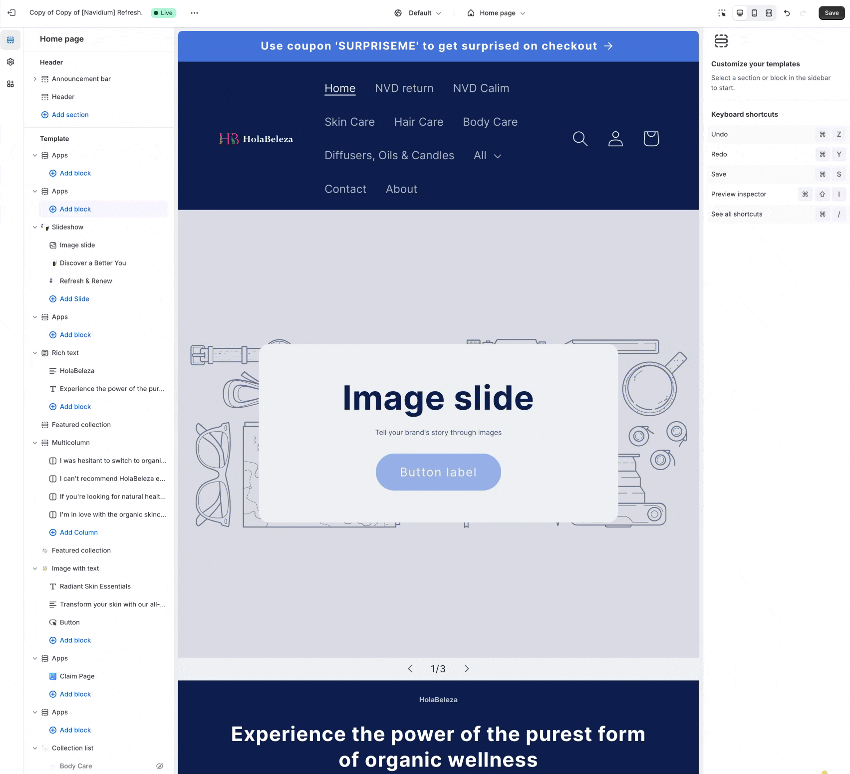 Shopify will now load up your Home page by default, but you can ultimately scroll around the site, or use the drop down in the middle of the top bar to navigate to pages, products, etc within the shopify admin.