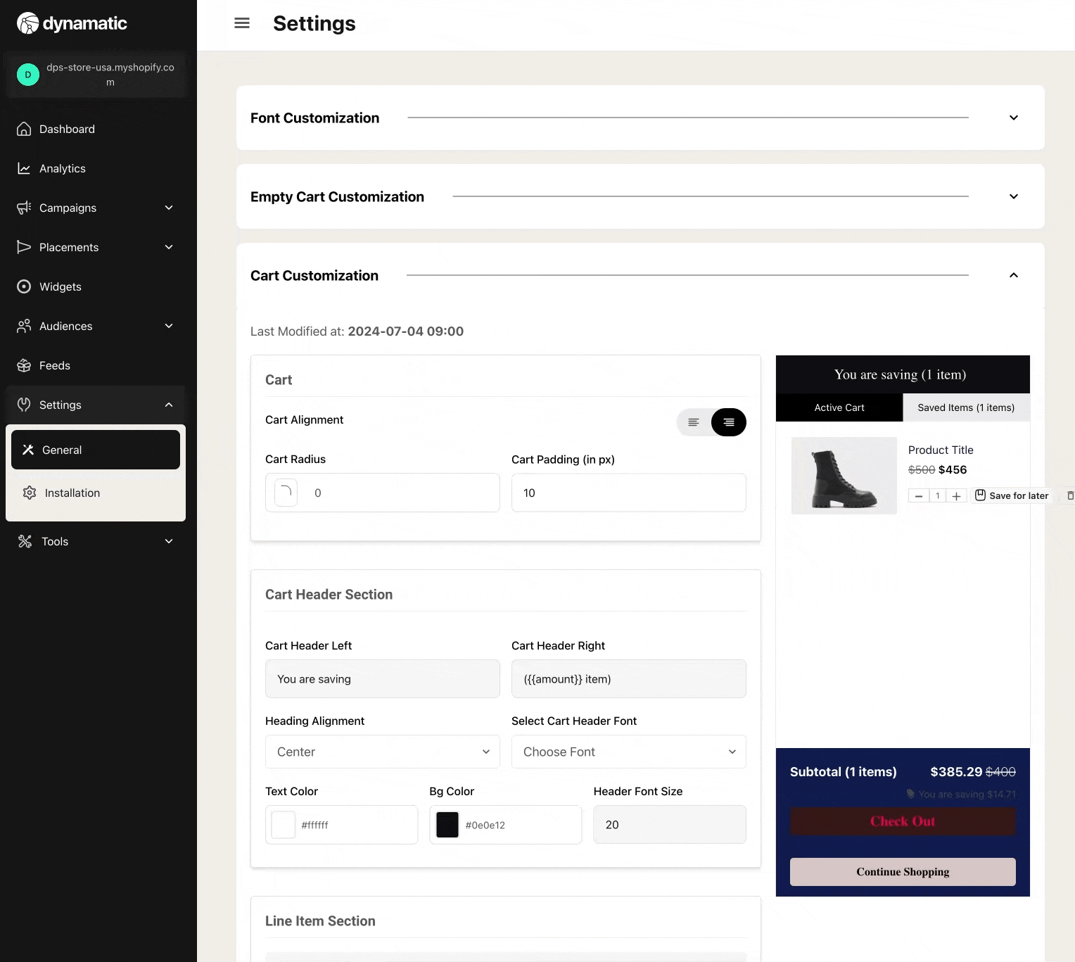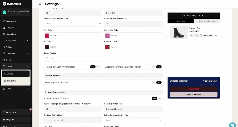 As part of the onboarding experience, one of the key features Dynamatic brings is a fully customizable slide cart draw. This draw is packed with features allowing merchants to add widgets to their cart that are personalized based on Campaign and Audience.