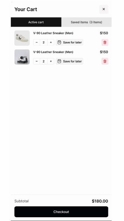 When enabled, Dynamatic App adds a tabbed system to the cart draw. Customers also see a small "Save for Later" link below each item they add to cart. Customers can then add items to the "Saved Items" tab, or move them back to the cart at will.