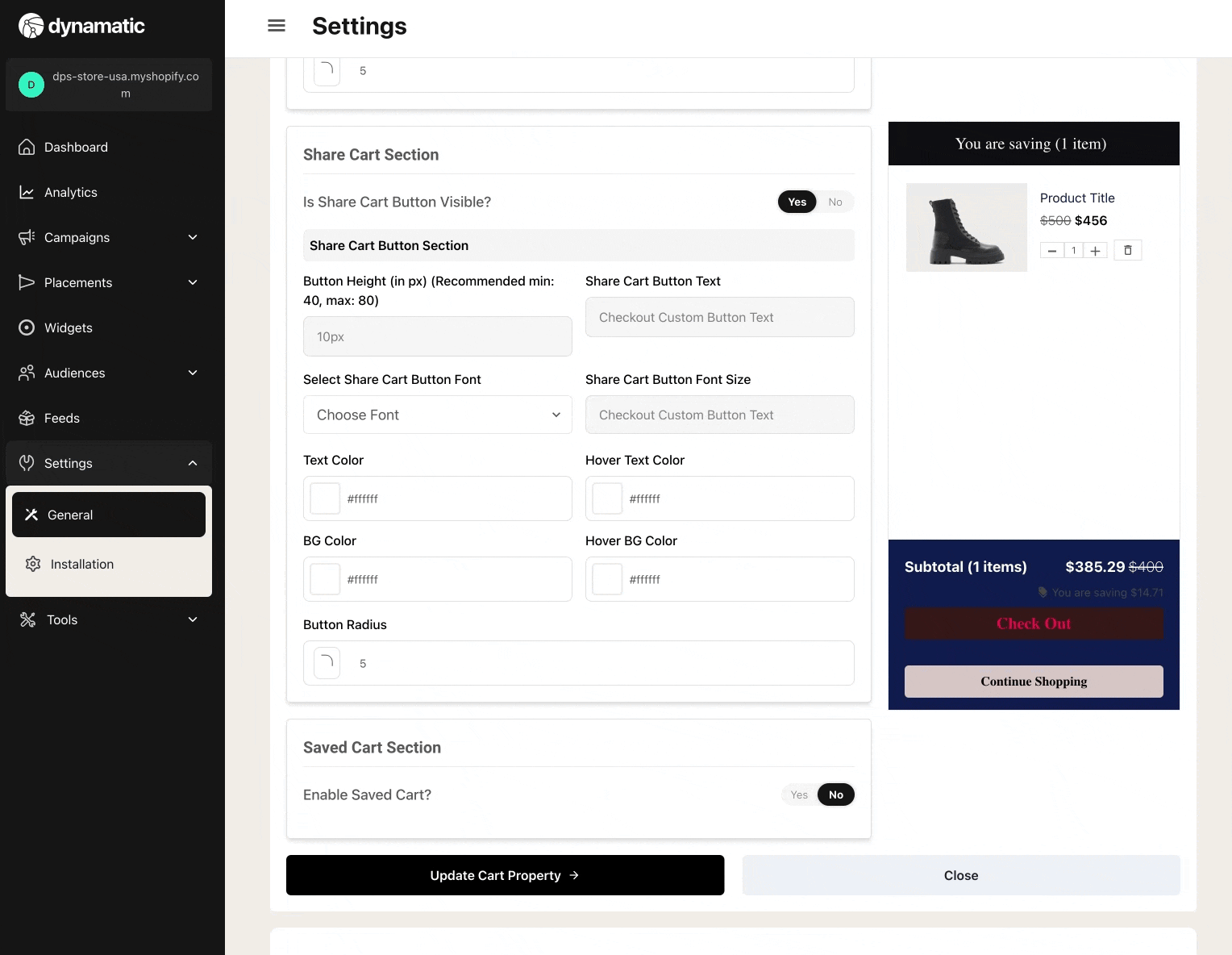 Expert Tip: Dynamatic App stores all the "saved items" in our system as well, and makes it available to be used as an endpoint or "product type" in all our product based widgets. For example, when creating a carousel widget, you can select the source of the items in the carousel, from Manual, Feed, or "Saved Cart".