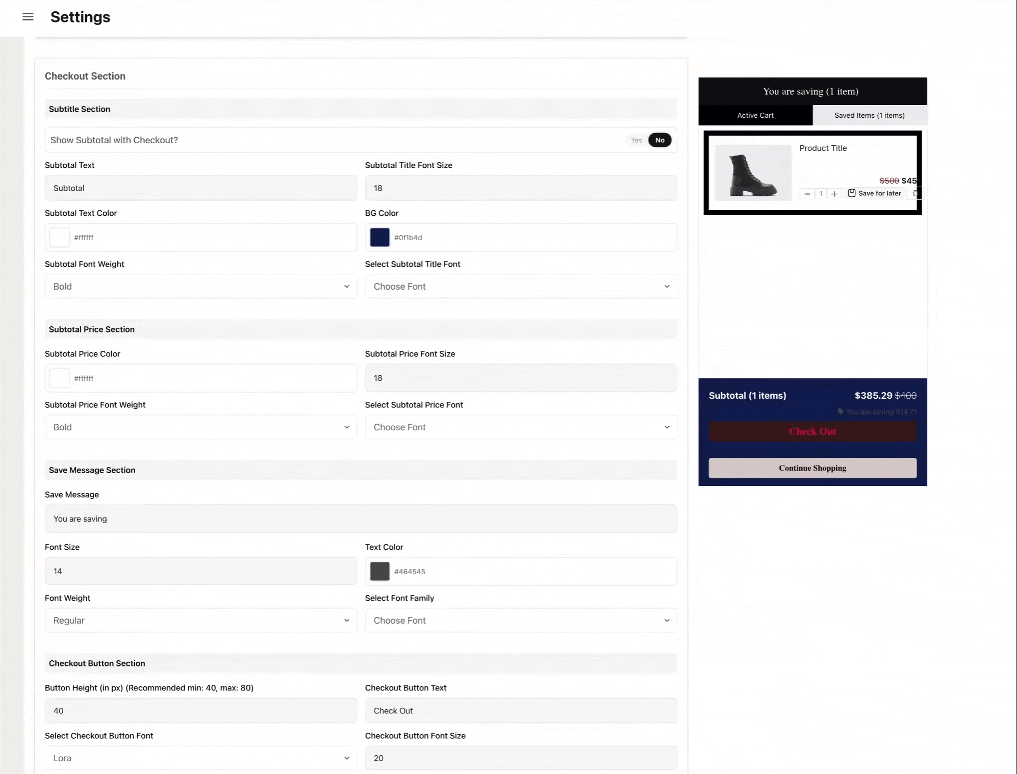 The next portion of the cart style editor controls the bottom portion of the cart where the Checkout Button and subtotal sits.