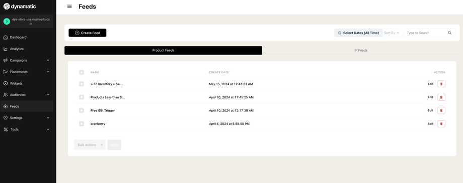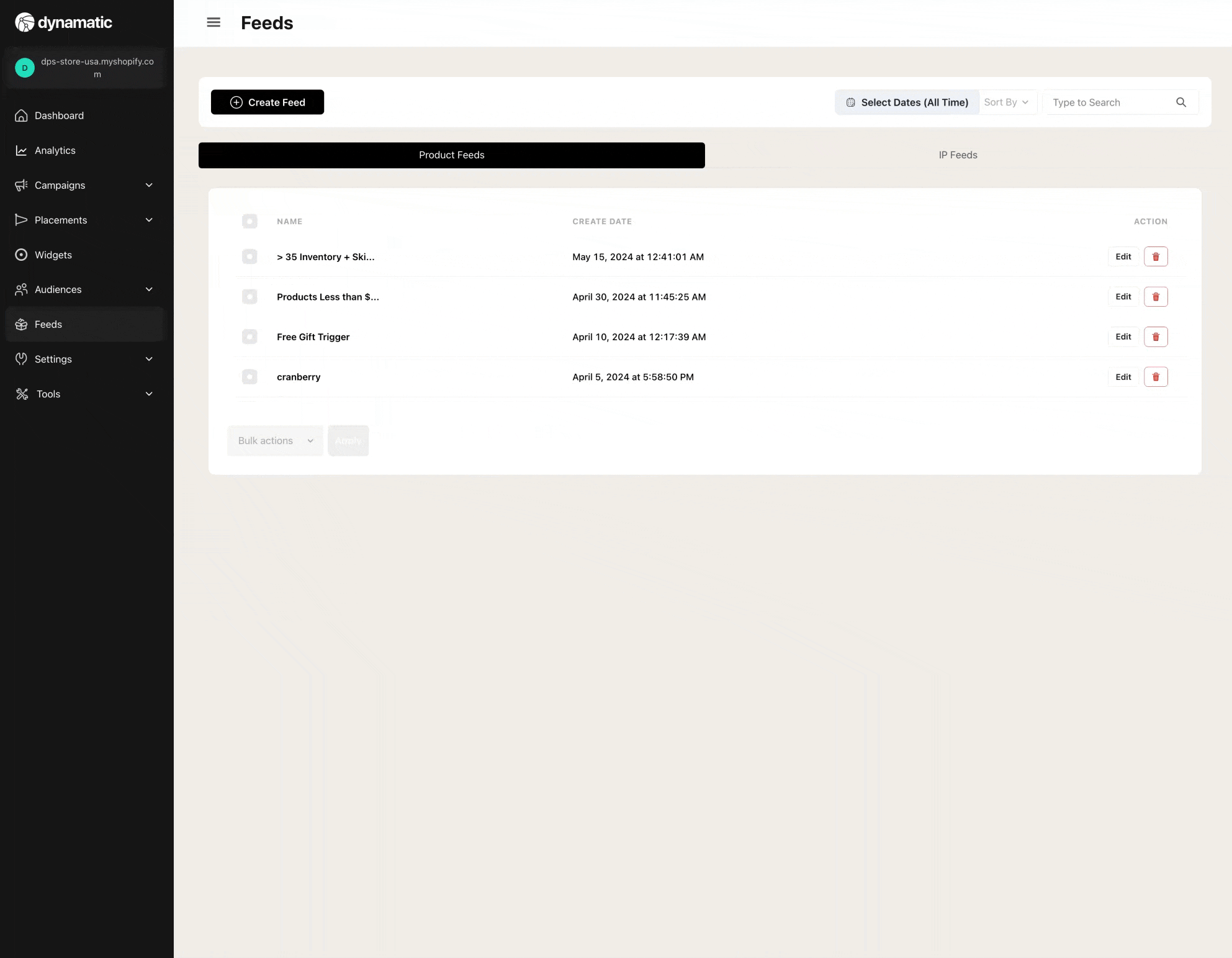 Step 1: Visit the Feeds section on the Dynamatic App backend navigation. When clicked, you'll be taken to the feed listing page which displays all your existing feeds or groups. You can see the date you created it, the name of the feed, and edit the feed rules as needed.