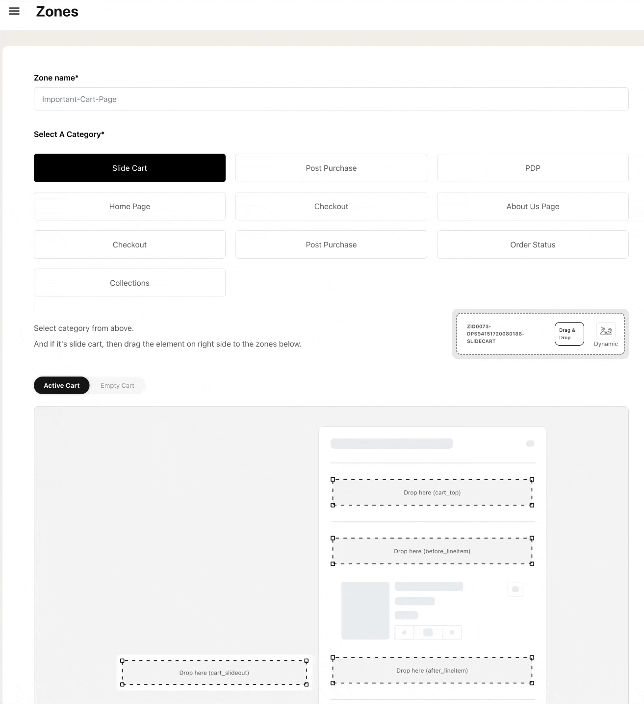 Our placements utilize Theme Extensions for every page of the store other than our own Slide Cart Draw. You create a zone and give It a friendly name, and we give you back a Zone ID. That zone ID gets pasted into the theme extension in your Shopify admin theme editor, and you drag and drop it exactly where you want that zone to be. Once saved, a relationship is created between that Zone on your theme and Dynamatic, so that anything you assign to that zone, will eventually display there. You can have as many zones as you like!
