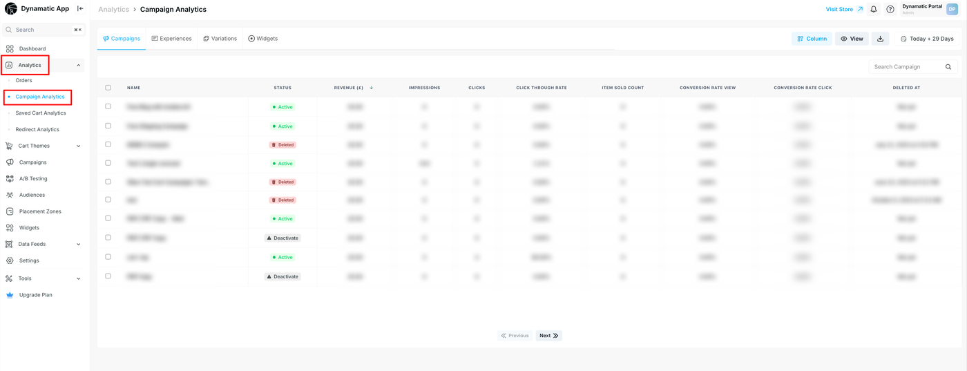 The Campaign Analytics page allows merchants to evaluate the ROI (Return on Investment) of their marketing efforts. It provides a granular look at how customers interact with specific campaigns, from initial impression to final purchase.