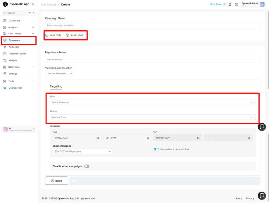 After navigating to Campaign → Create New → Add Experience, you will be taken to the campaign creation page. This is where you will name your campaign and set up the details of the experience.