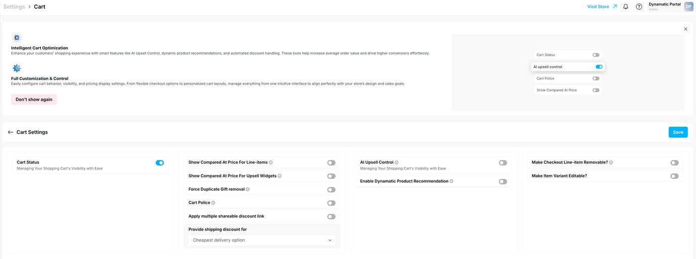 The Cart Settings page (located under Settings > Cart) allows merchants to manage shopping cart visibility, pricing displays, and AI-driven conversion tools.
