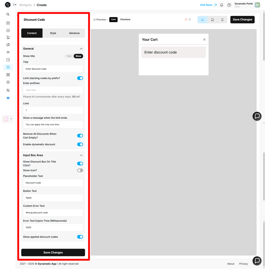 Configuration Options: You can enable or disable the discount input, restrict it by audience or campaign, and customize error messages for invalid codes.