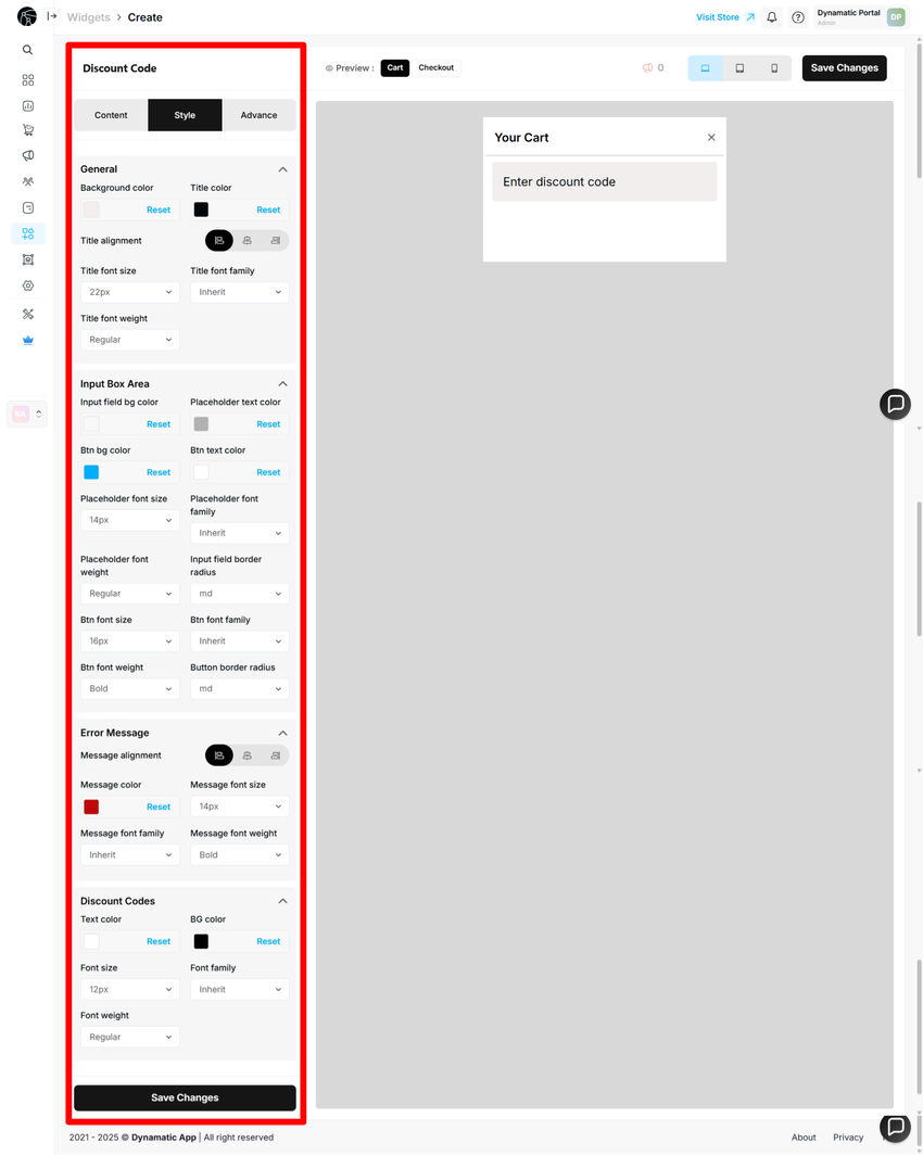 This part allows you to customize the styling of the discount code text itself. You can change the: