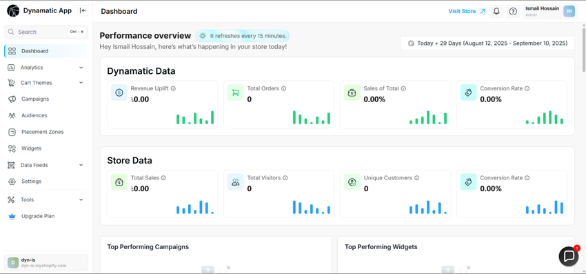The main Dynamatic dashboard provides a high-level overview of your store’s performance. It features dynamic bar charts that display key metrics such as total revenue, campaign performance, and monthly sales data. You can customize your view to analyze this data on a daily, weekly, or monthly basis. All charts update in real-time to reflect your live data.
