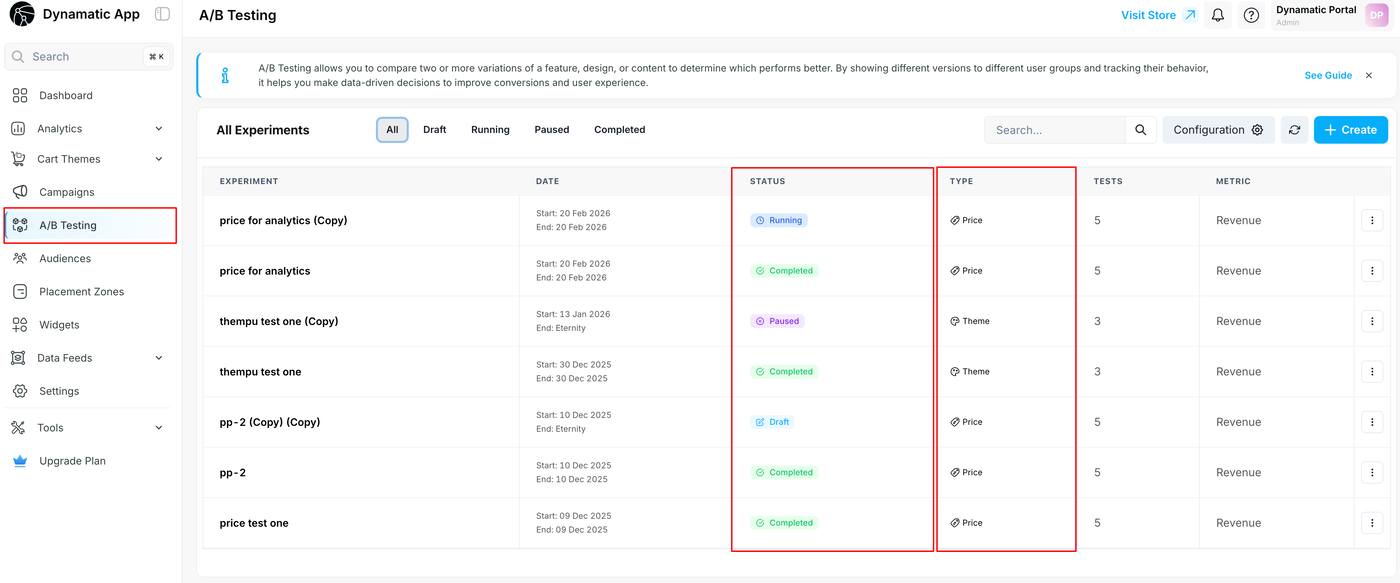 Identify the TYPE: Use this column to see the specific category of the A/B test you built, such as a Price test or a Theme test.