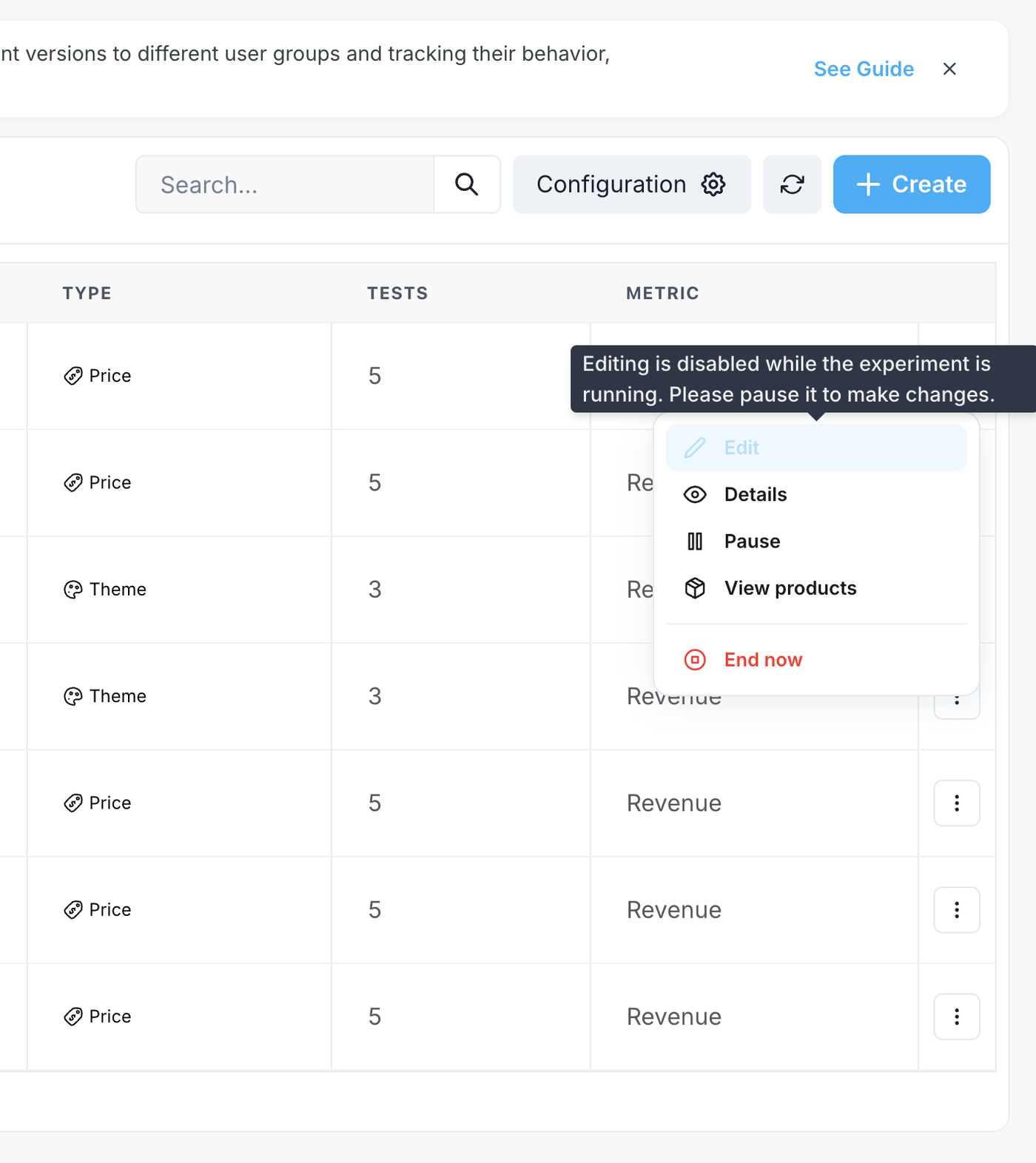 Open the Action Menu: Locate your running experiment in the dashboard list and click the three-dot icon on the far right side of the row.