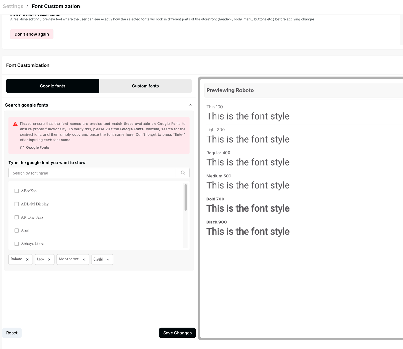 Live Preview: Instantly see how different font weights and styles will appear on your storefront before applying changes.