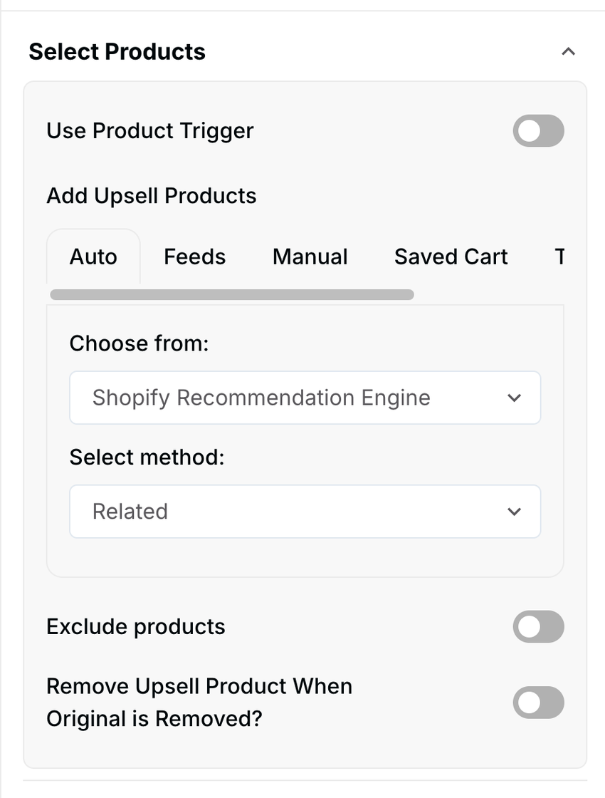 | Product Selection | Defines the recommended items presented in the pop-up. | Products can be added Manually (hand-selected), via Feeds (dynamic groups), or through advanced options. |