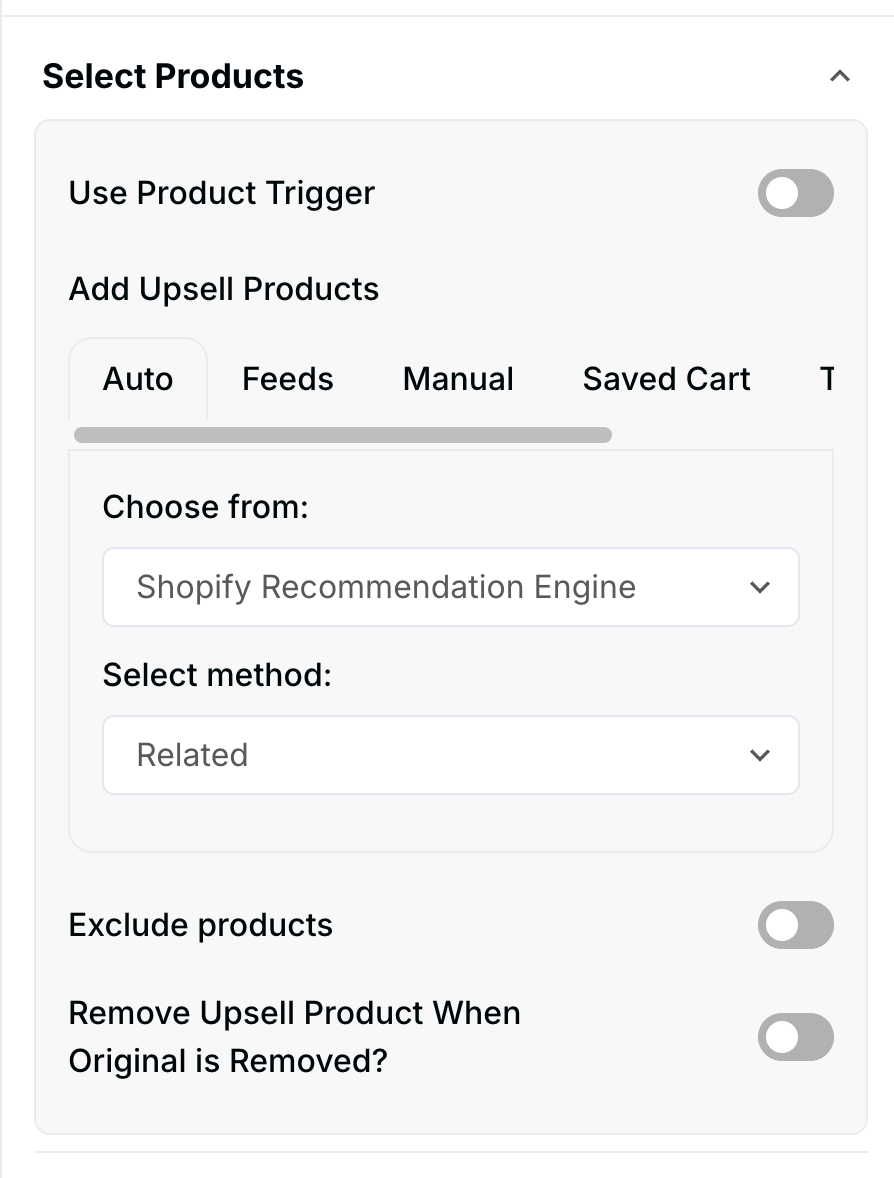 Product Selection | Defines the recommended items presented in the pop-up. | Products can be added Manually (hand-selected), via Feeds (dynamic groups), or through advanced options. |