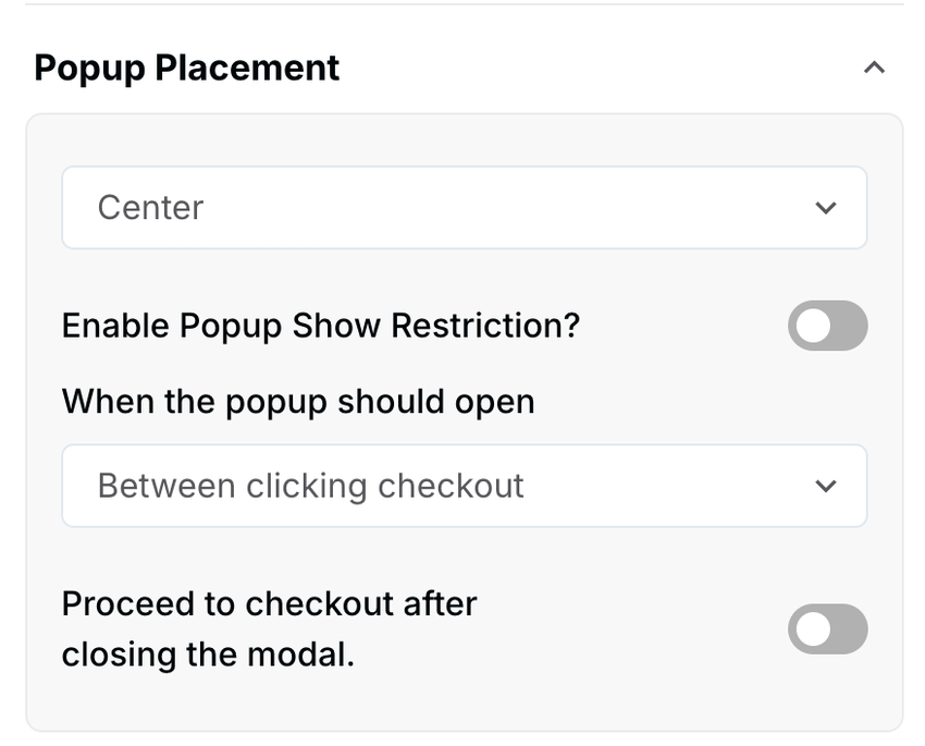 | Trigger Products | Sets the specific products whose presence in the cart (or on the page) triggers the interstitial pop-up. | You can select one or multiple products that must be viewed or added to cart to activate the offer. |