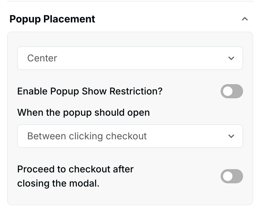CTA Button | Controls the buttons on the pop-up. | Customize the text and appearance of the main CTA (Add to Cart) and the Skip and Go button. |