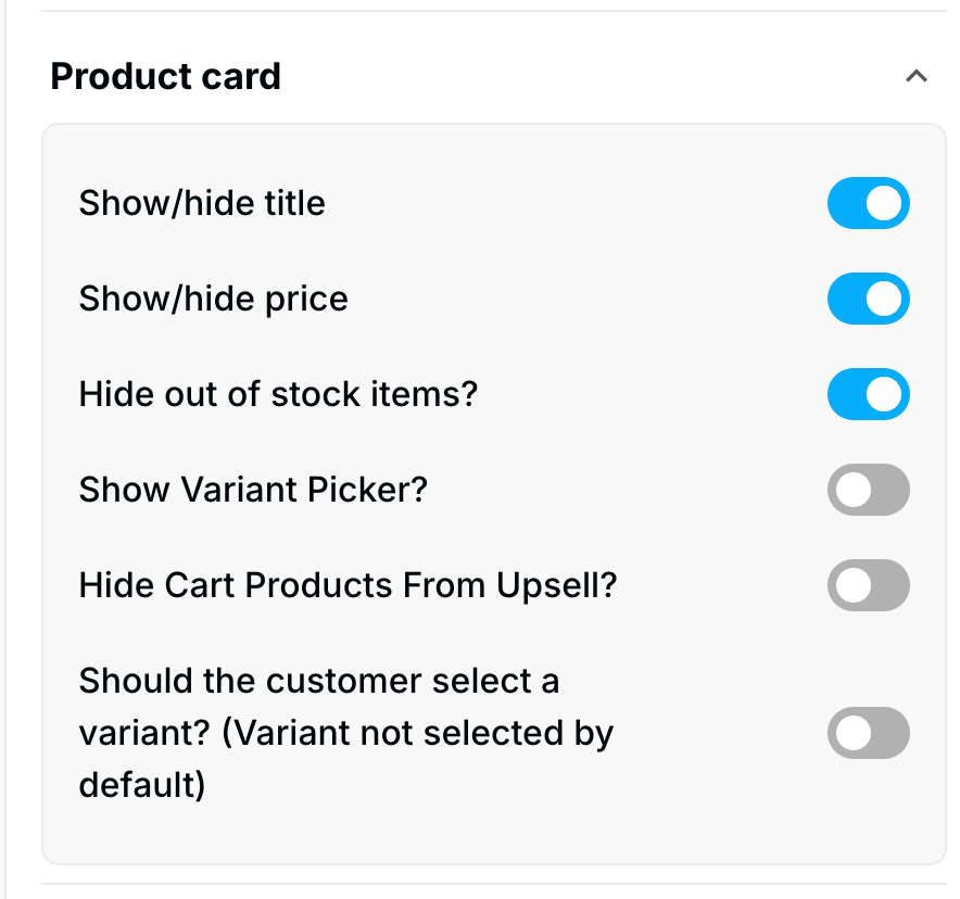 Display Elements | Customizes what the customer sees on the modal. | Configure the visibility of the product card title, price, stock, vendor, and variant picker options. |
