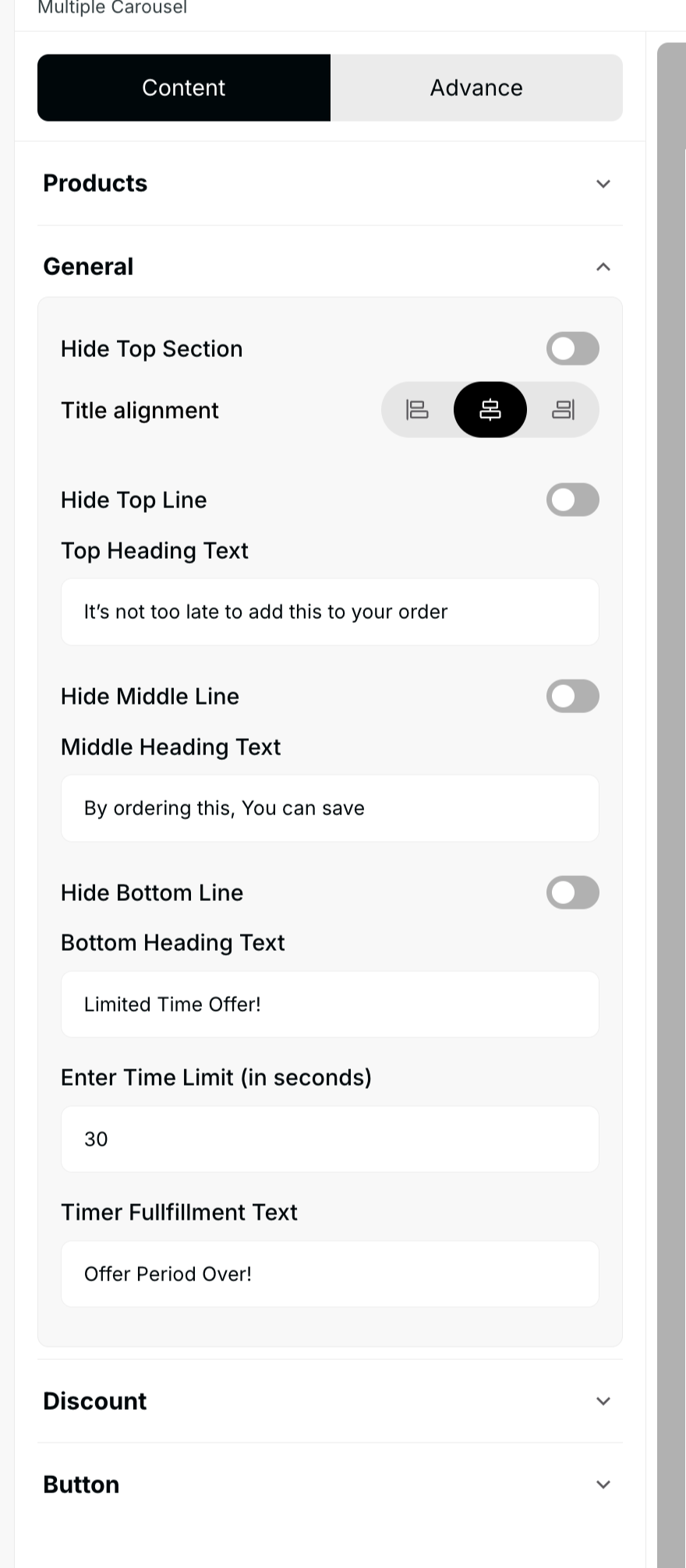 Additional Elements | Enhances the offer with urgency and action. | Configure a timer for limited-time offers, set a discount value, and customize the button text/style. |