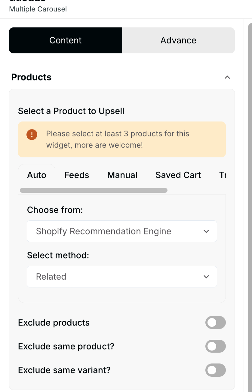 Quantity Requirements | Sets the minimum number of products needed to populate the carousel. | A minimum of at least 3 products is required per carousel. |