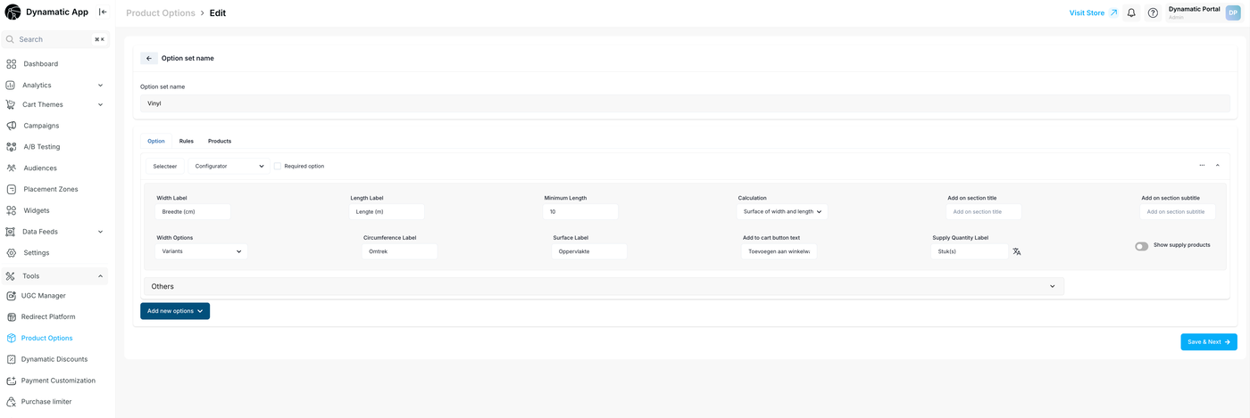 The Product Options tool in the Dynamatic App is a powerful feature designed to enhance your storefront by adding customizable fields and choices to your products. This tool allows you to create complex product configurations, such as size selections, material upgrades, or add-on services, while managing pricing adjustments and conditional logic.