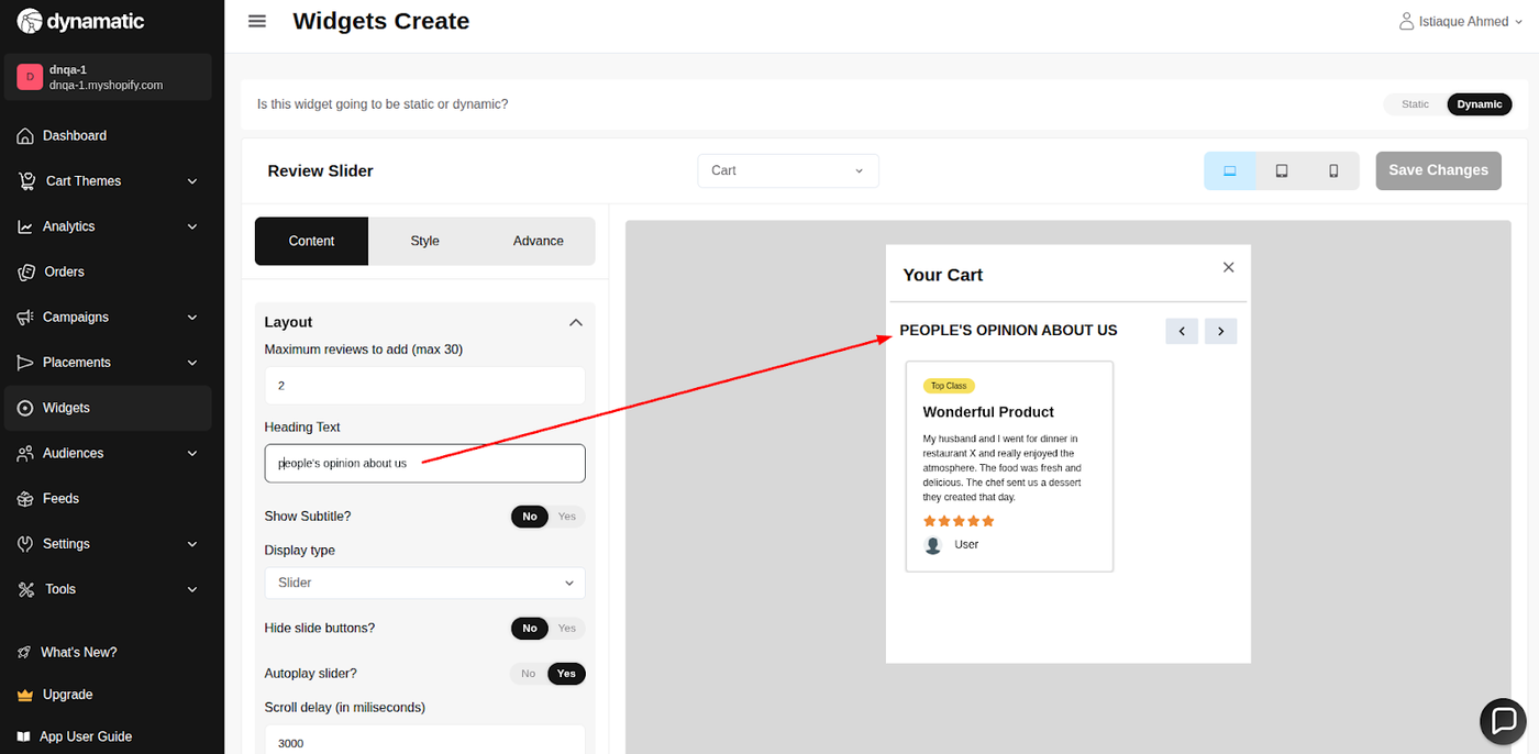 The Content section is where you define the reviews, control the carousel behavior, and set the display text.