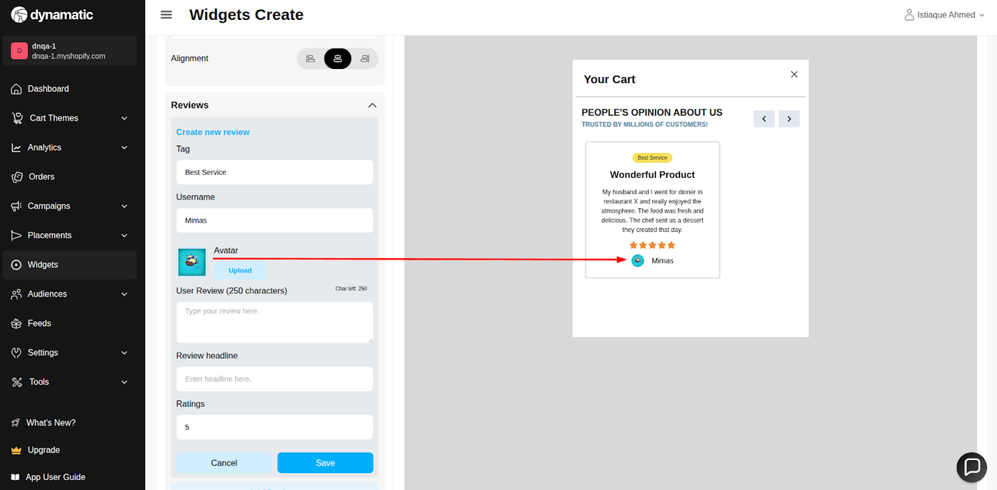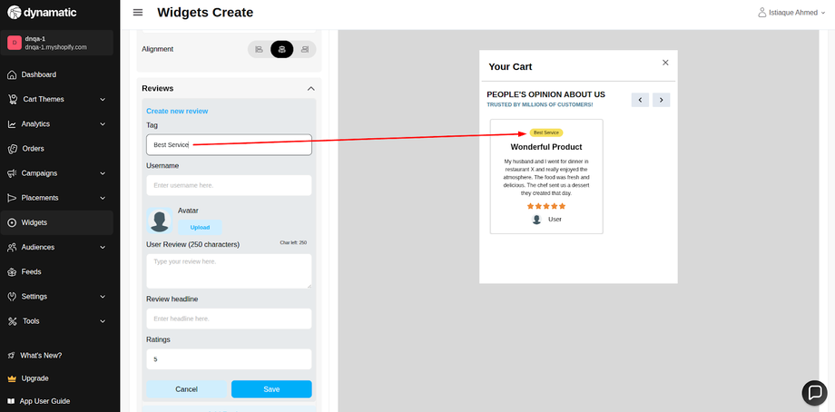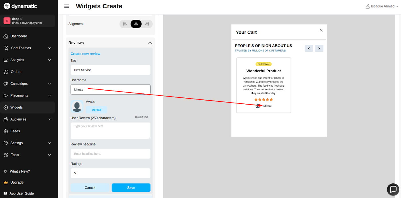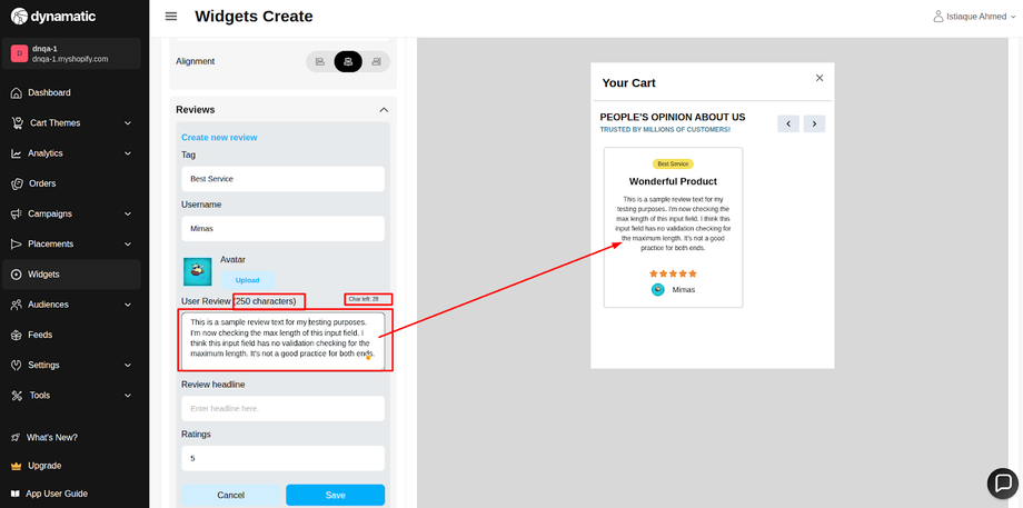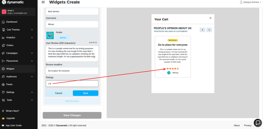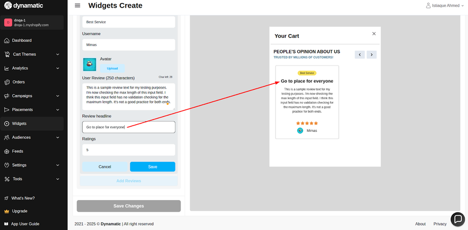 Review Content | Manually entering or configuring review details. | Username: Provide the name of the reviewer. Tag: Provide a tag for categorization/filtering. Avatar: Upload an image of the reviewer. User Review: Write the feedback text (Max 250 characters). Review Headline: Edit the review's title. |