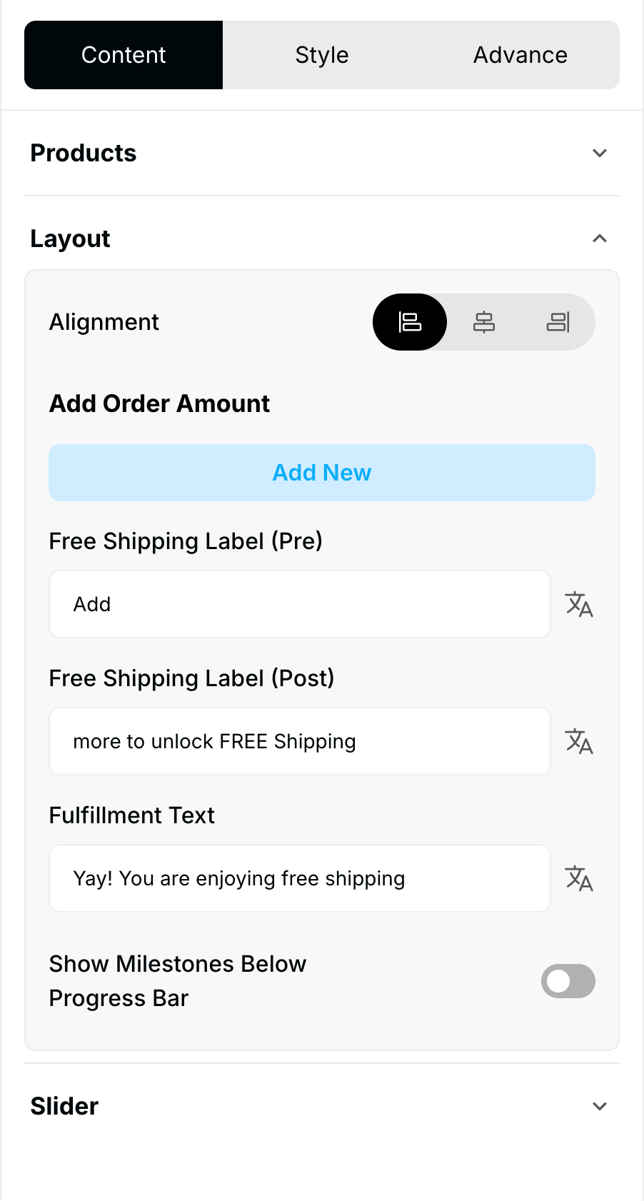 | Custom Messaging | Customize the messages displayed to the customer at each stage: | Free Shipping Pre-label: Message shown before the customer reaches the goal (e.g., "Only $X away!"). Free Shipping Post-label: Message shown after the goal is reached (e.g., "Congratulations! Free Shipping Unlocked!"). |
