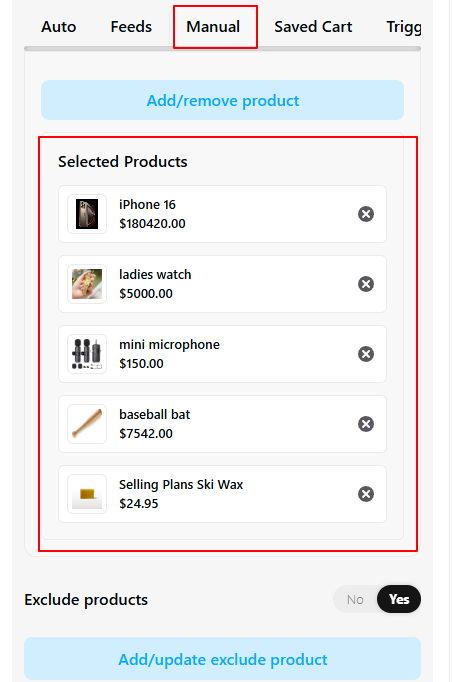 Product Selection: Since we are using the Manual option, upload the specific products you want to feature as upsells in the slideout panel.