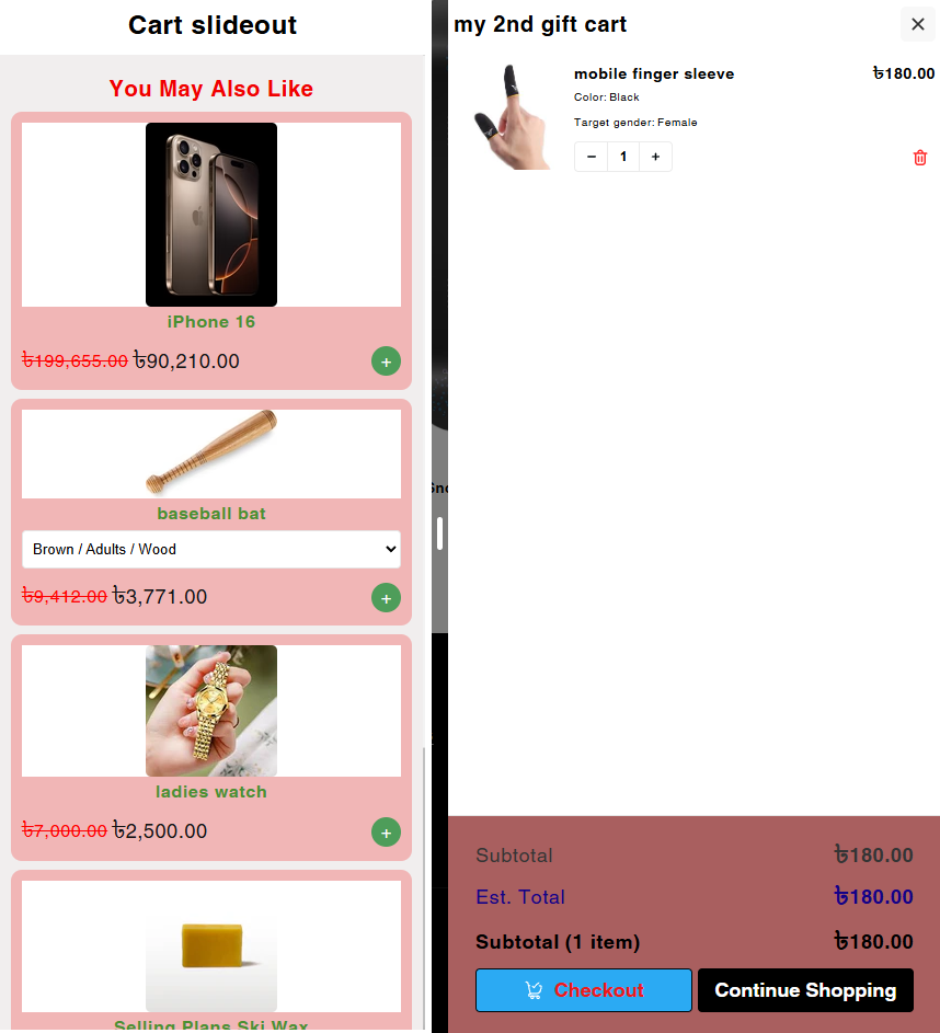 Purpose: Adds a visually engaging upsell or cross-sell section within your dynamic cart as a slideout panel. It suggests related or high-margin products while the customer reviews their cart, helping to increase AOV.
