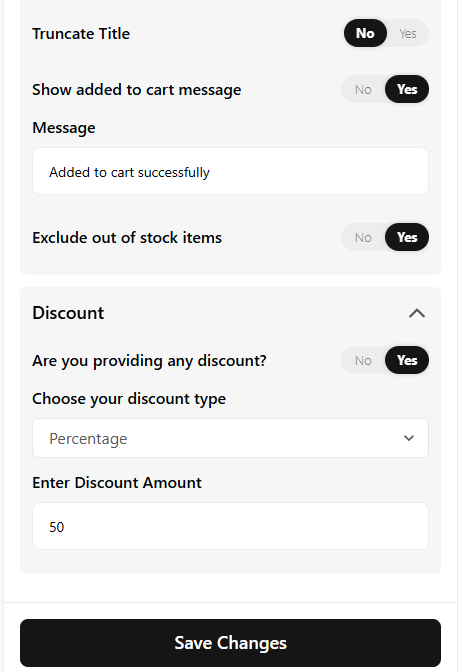 Product Settings: Adjust the appearance of the product cards, including image size and layout.
