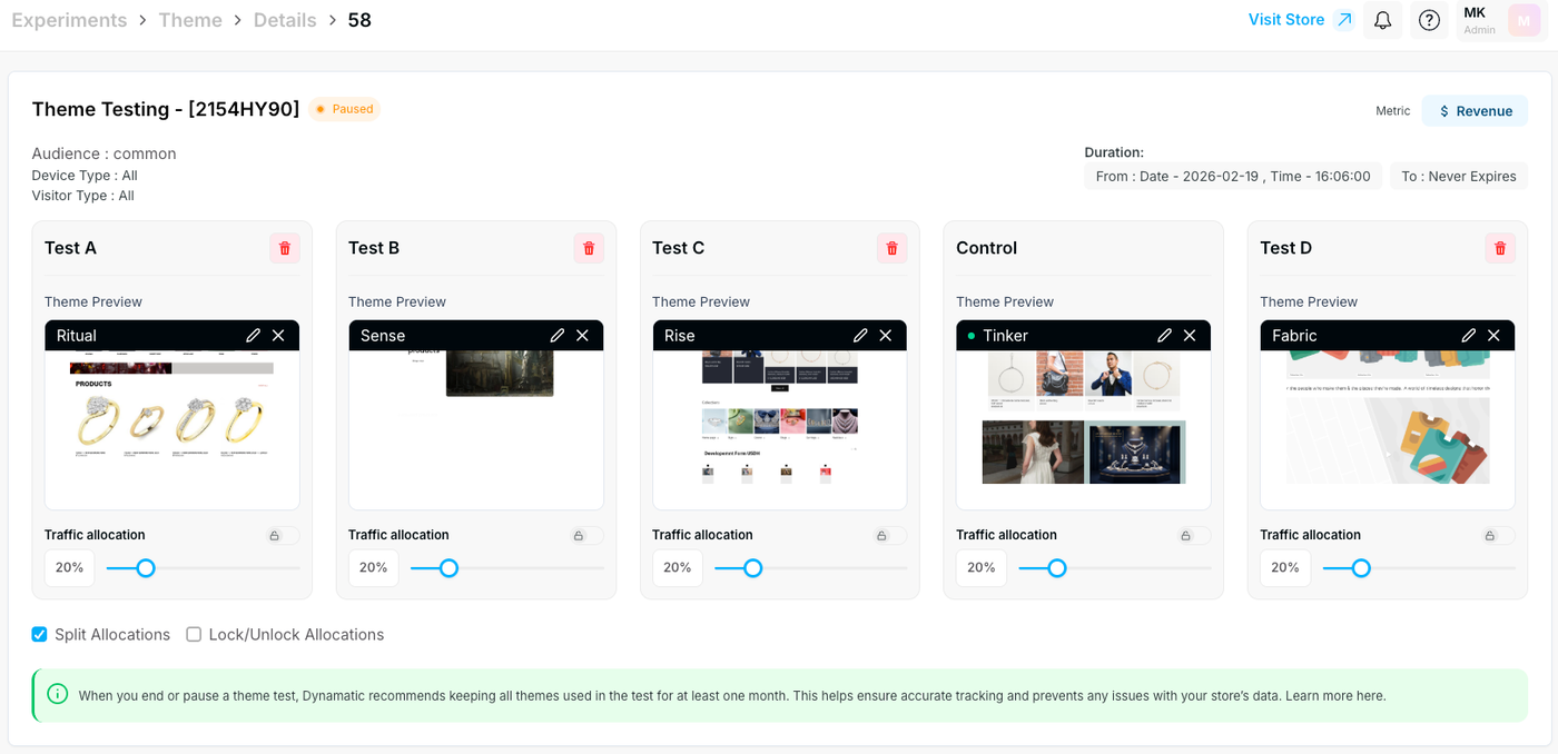 Dynamatic Recommendation: > When you end or pause a theme test, we strongly recommend keeping all themes used in the test installed in your Shopify admin for at least one month. This helps ensure accurate tracking for returning visitors and prevents any issues with your store's data.