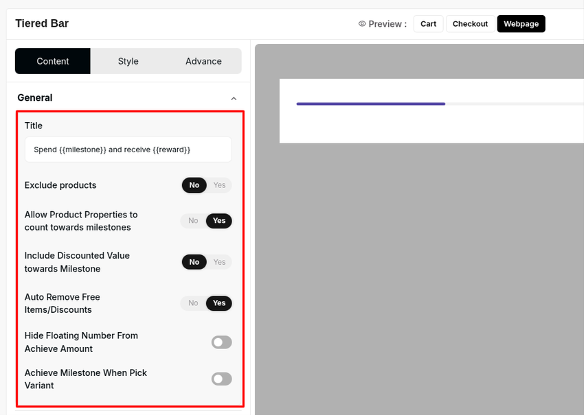 Exclusions: Define any products or product tags that should not count toward the Tiered Bar total.