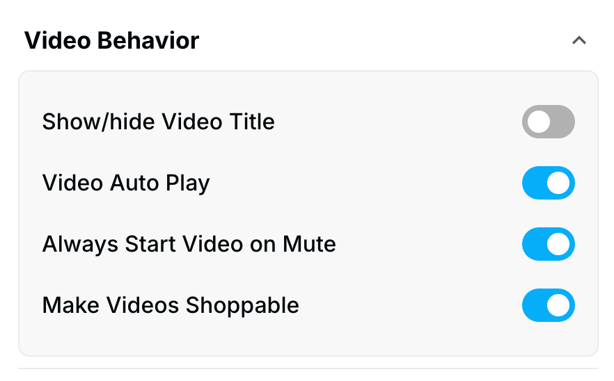 Video Behavior | Defines automatic playback and player features. | Set video auto play and the option to always start video on mute. Enable the setting to make videos shoppable (linking video content to promotional offers). |